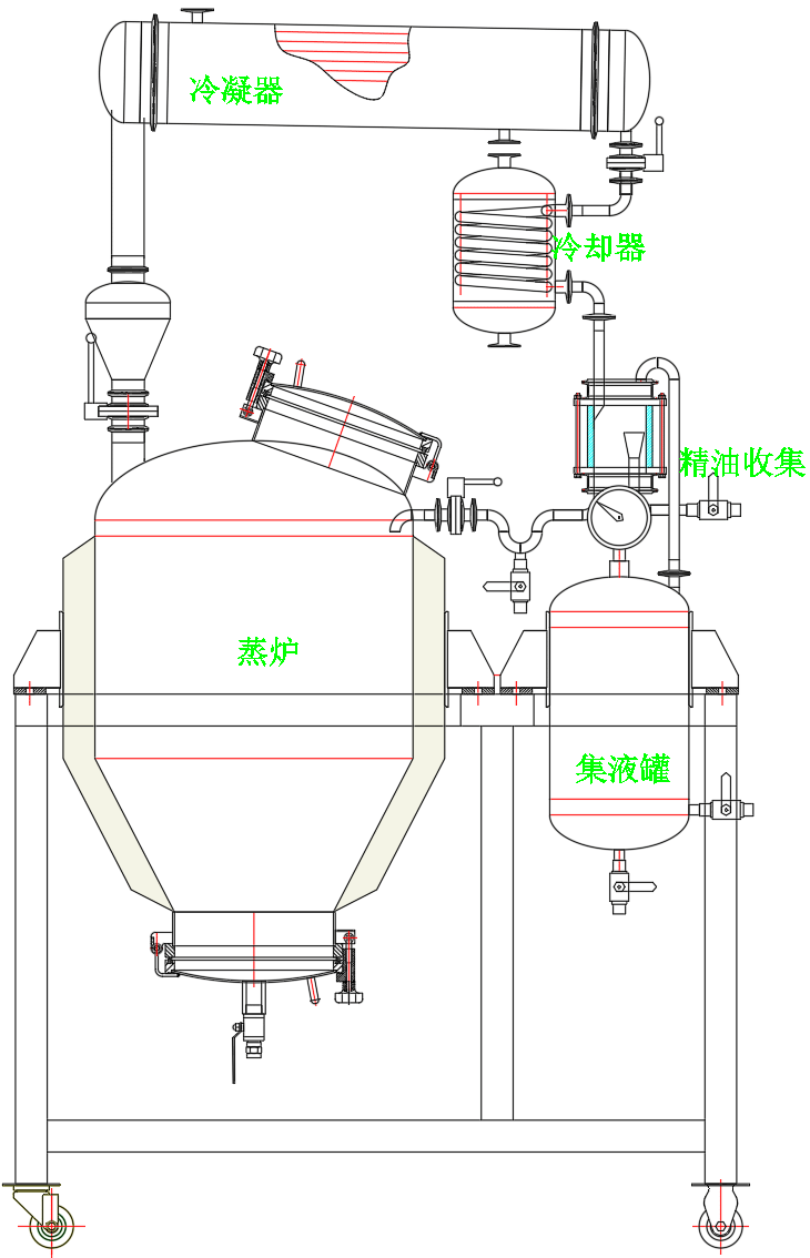 工藝流程:開啟加水,可隔水蒸餾,也可共水蒸餾,開電加熱或蒸汽,水沸騰產(chǎn)生蒸汽,蒸汽透過提取機(jī)內(nèi)物料,隨及將精油純露析出,精油純露蒸汽沿排汽管上