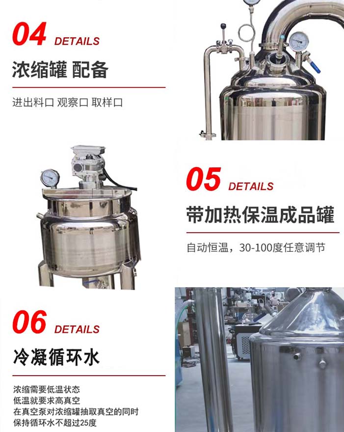 應和真空泵一直要開著,冷卻水的溫度越低越好。在濃縮過程中排出的二次蒸汽經過冷凝器被及時冷卻成水進入回收罐。
